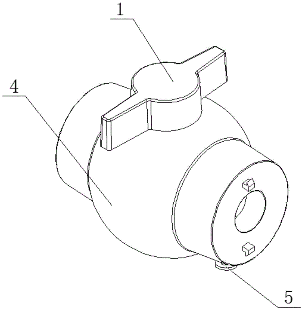 工作原理:首先將管體4進(jìn)行連接后,轉(zhuǎn)動開關(guān)鈕1帶動轉(zhuǎn)動塊2轉(zhuǎn)動,從而控制球閥3轉(zhuǎn)動進(jìn)行開關(guān),在與管道進(jìn)行連接時過程繁瑣,不便于快速安裝拆卸,可通過連接機(jī)構(gòu)5解決,需要連接時可將第一卡塊53和第二卡塊58對準(zhǔn)外接管道卡槽進(jìn)行插入,使第一彈簧55和第二彈簧510收縮后復(fù)位固定,需要拆卸時只需按下按壓塊51使推桿52帶動第一卡塊53使其通過第一導(dǎo)軌54向上移動,并且同時通過拉繩56拉動第二卡塊58使其通過第二導(dǎo)軌59向下移動脫離外接管道卡槽,從而達(dá)到便于安裝拆卸的效果,滑輪57起到固定拉繩56的作用,為解決在與管道進(jìn)行連接時過程繁瑣,不便于快速安裝拆卸的問題,通過在管體4左右兩端設(shè)置了連接機(jī)構(gòu)5,需要連接時可將第一卡塊53和第二卡塊58對準(zhǔn)外接管道卡槽進(jìn)行插入,使兩個彈簧收縮后復(fù)位固定,需要拆卸時只需按下按壓塊51使推桿52帶動第一卡塊53向上移動,并且同時通過拉繩56拉動第二卡塊58向下移動脫離外接管道卡槽,從而達(dá)到便于安裝拆卸的效果。